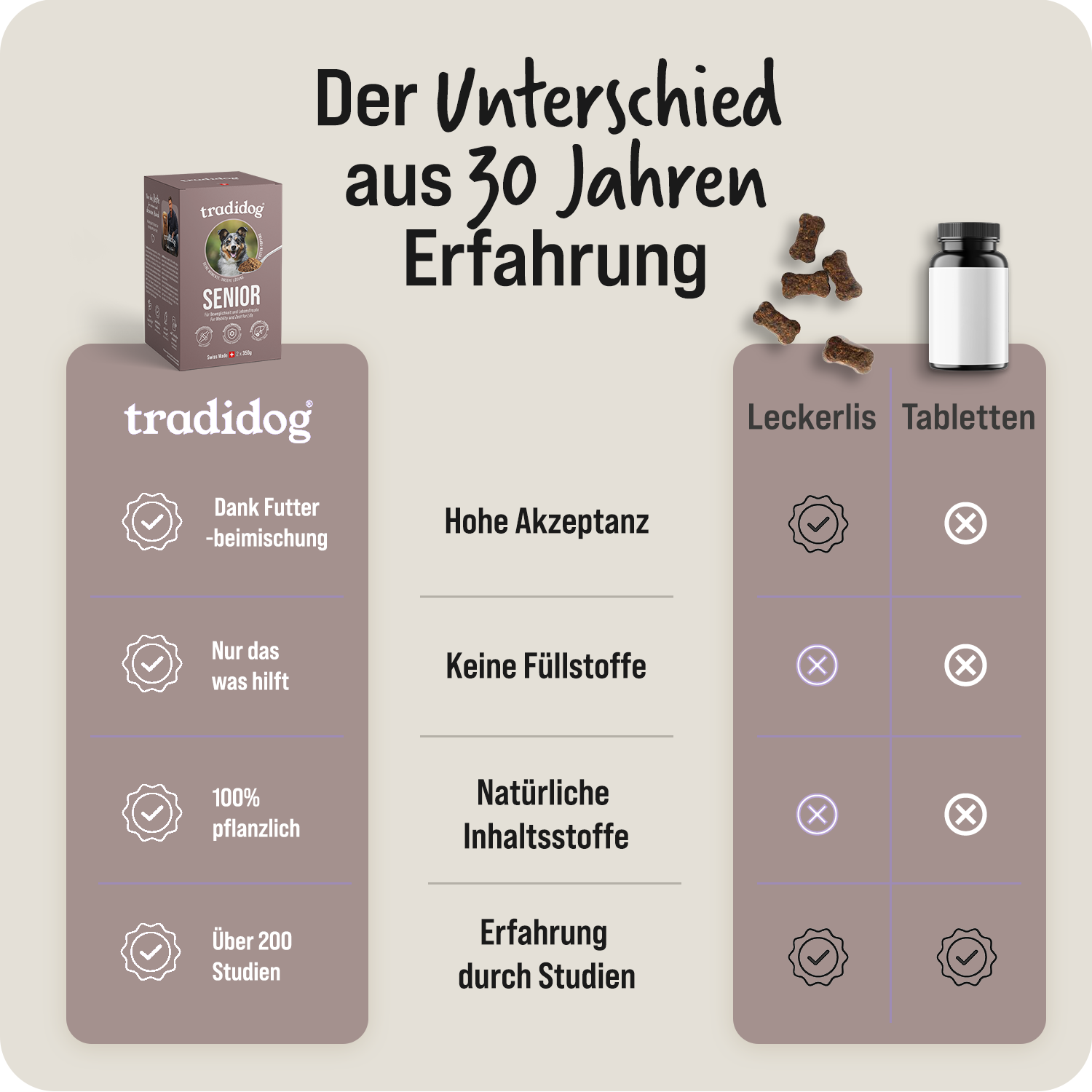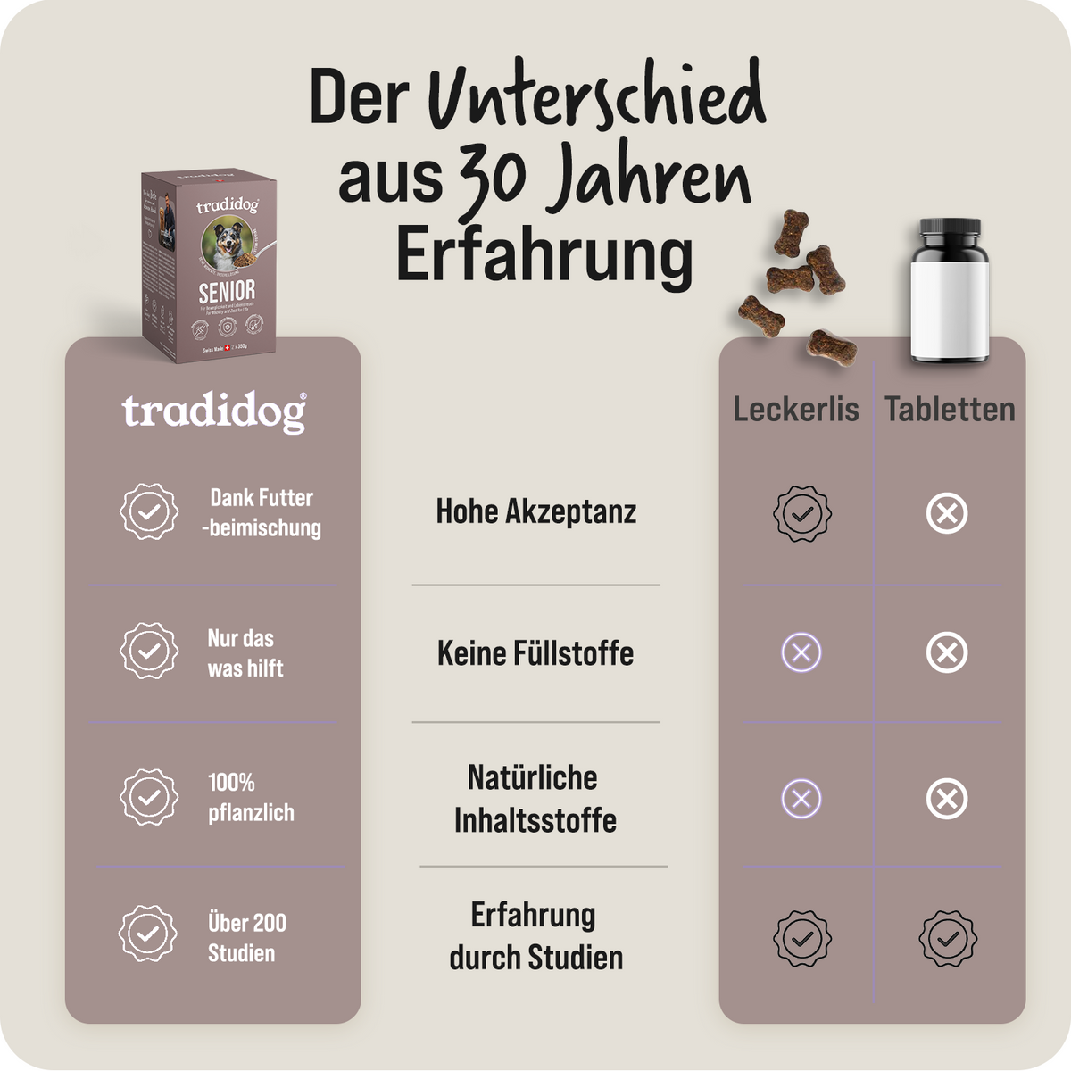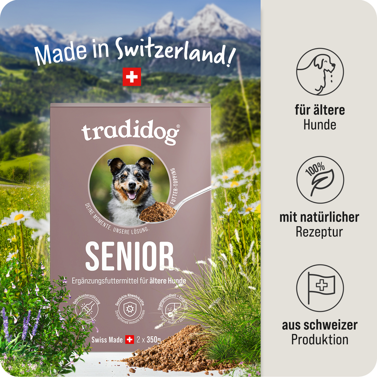 In Tradidog il vostro cane è al centro dell'attenzione, ogni giorno e con ogni decisione. Produciamo tutto da soli ed esclusivamente in Svizzera, con la cura e la precisione che ci si aspetta dalla qualità svizzera. I nostri ingredienti sono puramente naturali, provengono da coltivazioni controllate e sono lavorati in modo tale da conservare tutta la loro forza vegetale. Perché crediamo che ciò che aiuta davvero il vostro cane provenga dalla natura - e da una vera responsabilità.