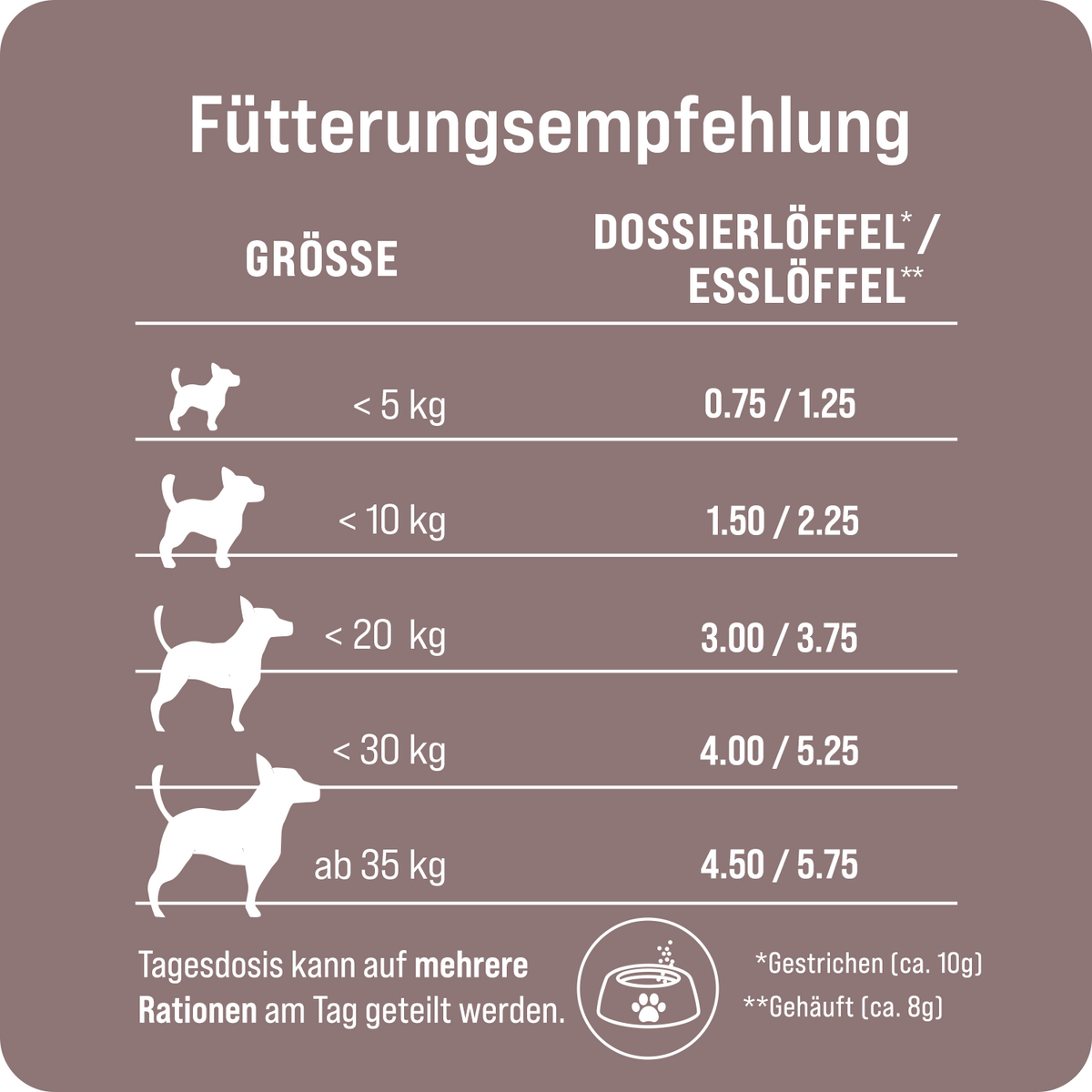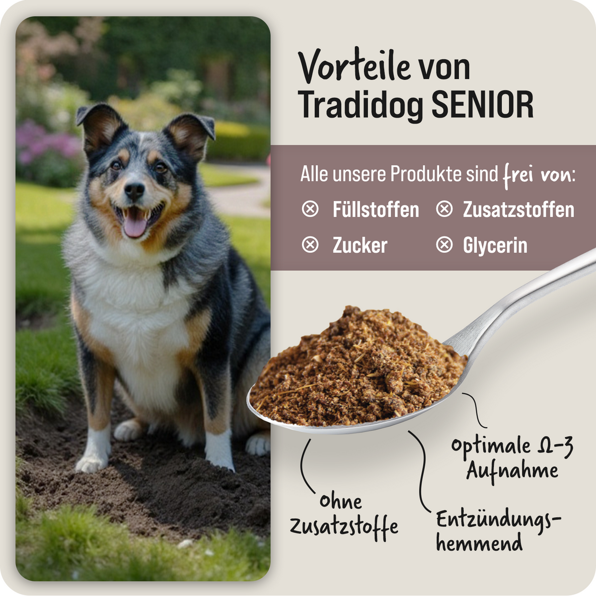 La maggior parte degli alimenti disponibili in commercio contiene un massimo di 2 g di omega-3 per razione giornaliera, che rappresenta solo il 50% circa del fabbisogno raccomandato per i cani di taglia media. Il topping di Tradidog, invece, fornisce 2,46 g di omega-3 per porzione, coprendo così in modo ottimale il fabbisogno. In questo modo il vostro cane riceve un apporto mirato di acidi grassi omega-3 di alta qualità! Per saperne di più